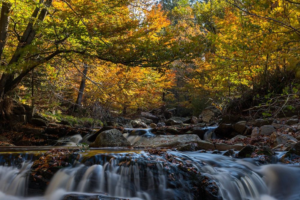 It is autumn in the Ardennes. Also at the Hoëgne. A true explosion of beautiful autumn colours along a fast flowing brook