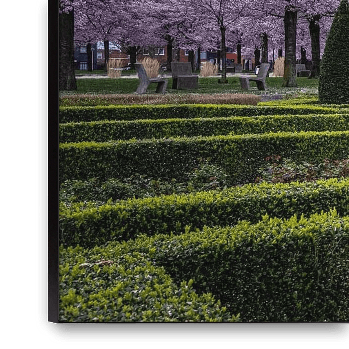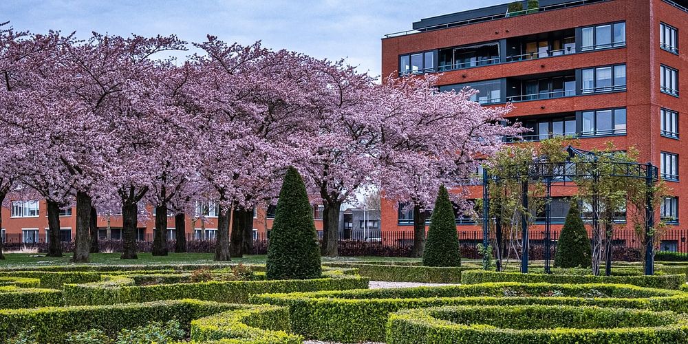 The neatly trimmed hedges form a geometric pattern that winds through the garden like a green labyrinth, whilst behind them a row of flowering ornamental cherry trees heralds the arrival of spring with a soft pink glow. …