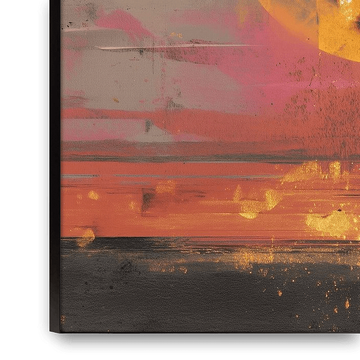 Holding Hands at Sunset - This woman and girl painting shows two silhouettes holding hands on the edge of a watery horizon, looking at a huge yellow sun as a circle in an abstract pink-orange sky, a warm modern abstract painting and sunset painting, painting woman and girl with strong yellow, orange and black accents.
