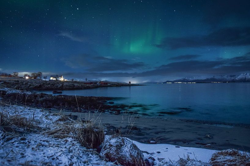 The coastline of the Lofoten Islands in Norway under the northern lights on a freezing cold winter evening.