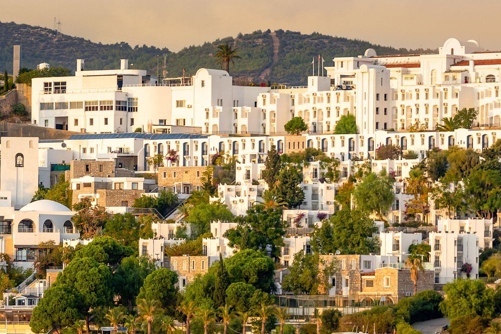 In the Turkish seaside resort of Bodrum all buildings have to be white or stone-colored according to the law. Just like this beautiful holiday resort. During the sunset, the colors of nature around this resort are even more beautiful.