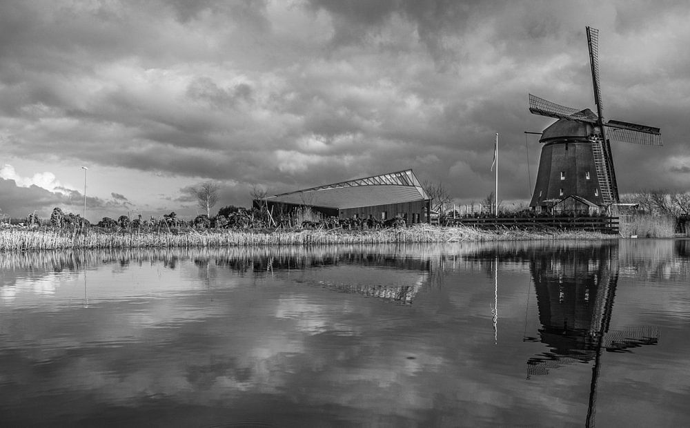 Twuyvermolen , with dutch skies and beautiful reflection in the water. This time in black and white