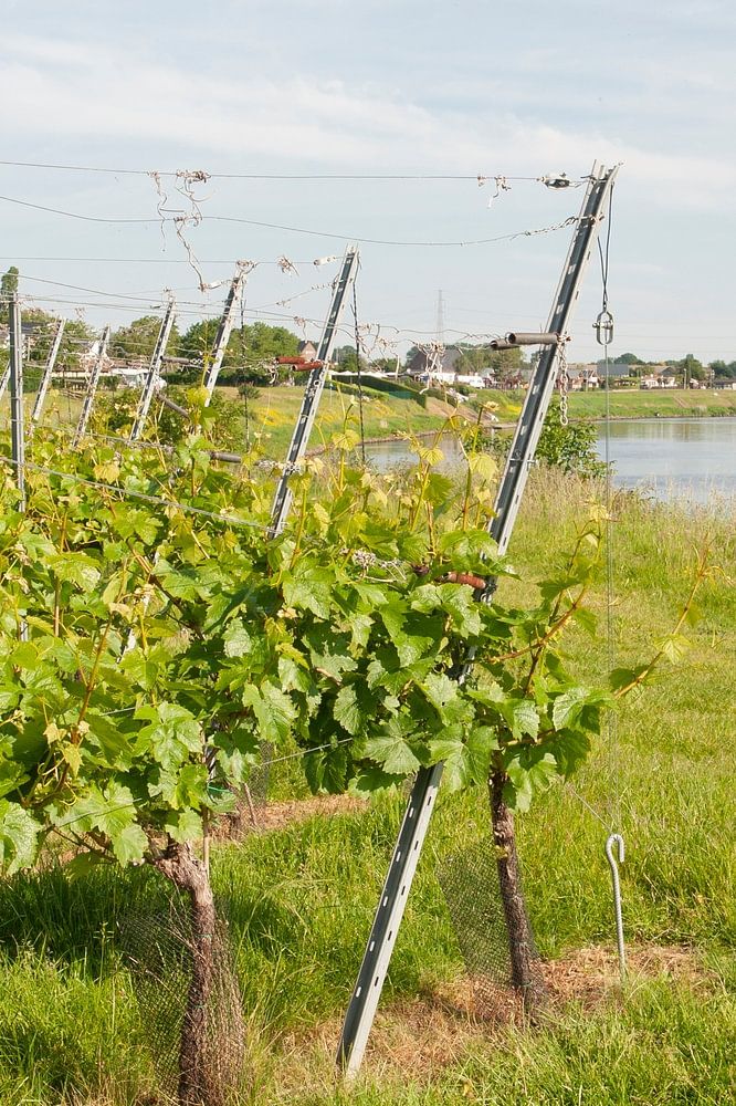 Aldeneik Belgium Belgium Vineyard with Chardonnay grapes on the banks of the River Maas. The river marks the border between Belgium and The Netherlands on the opposite bank.