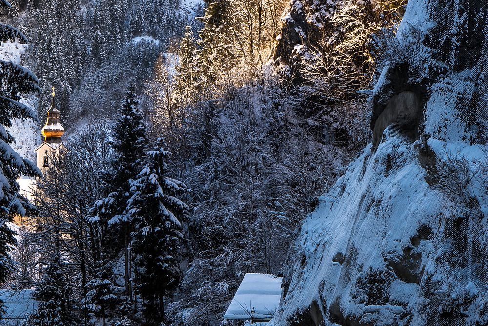 De ondergaande zon die zijn laatste straaltjes laat schijnen op het idyllische kerkje in de besneeuwde bergen in de Oostenrijkse alpen.