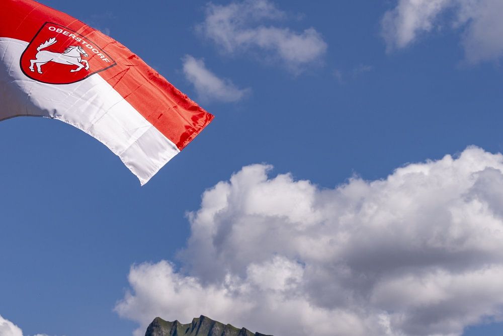 High up on the Untere Lugenalpe, where the world seems quieter and the sky wider, the flag of Oberstdorf flies proudly in the wind. It dances against the deep blue firmament, framed by white fair-weather clouds that drift like gentle specks on the horizon. Its momentum tells of love of home, of tradition and of the rugged yet delicate beauty of the Allgäu Alps.