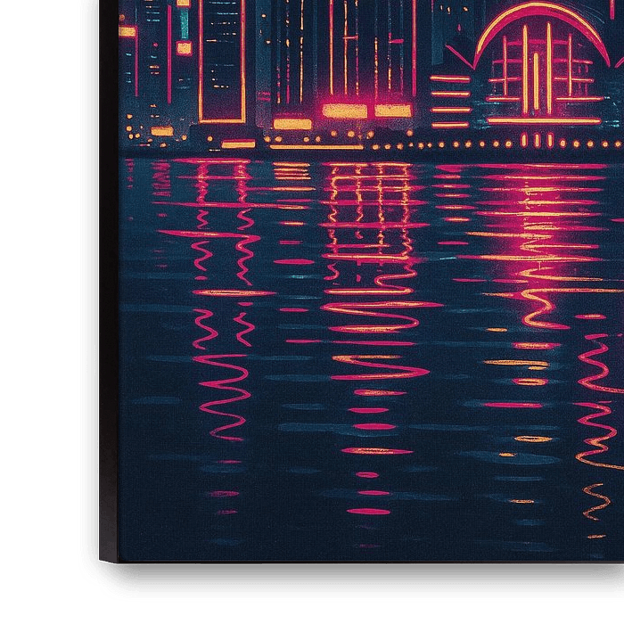 Capture the dramatic allure of the Hong Kong waterfront with this striking Art Deco-inspired vintage poster. The artwork focuses on the Hong Kong Convention and Exhibition Centre with its distinct curved roof, set against a backdrop of towering skyscrapers. The scene is dominated by a moody, dark color palette accented with sharp,…