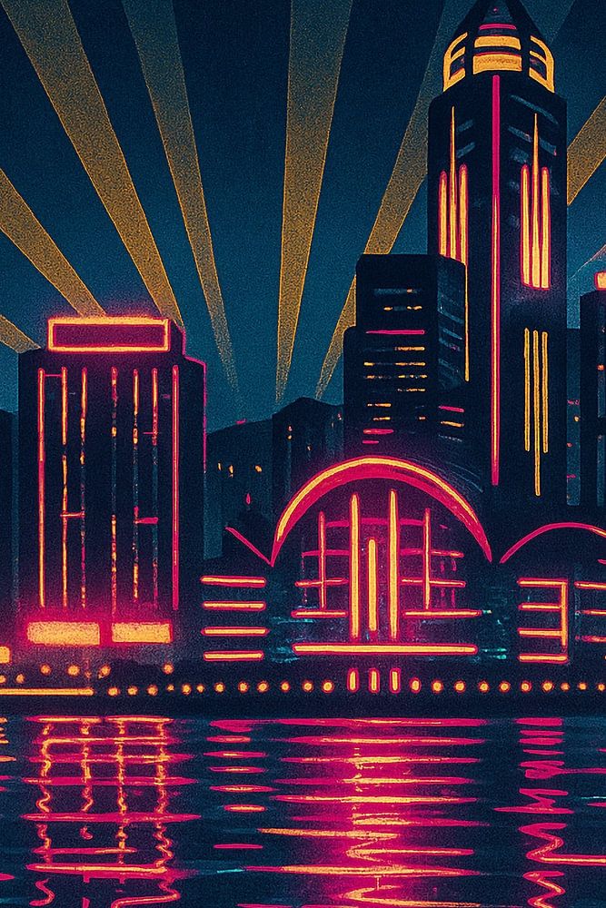 About ‘Hong Kong Art Deco Poster – Red Neon Skyline & Convention Centre’ by Travel Shop