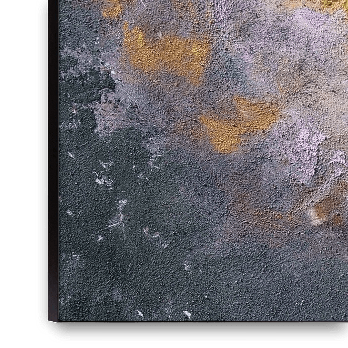 This work, POD of acrylic on canvas with gold leaf effect (imitation gold leaf, 2024), is about the power of light and hope returning. The canvas shows a layered play of colours: soft shades of pink and lilac merge with cool greys and whites, as if clouds were slowly opening up. Between those layers, planes of gold leaf sparkle, giving…