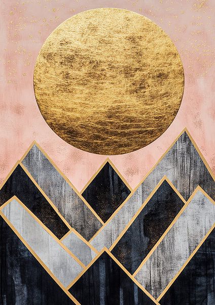 Abstract geometric shapes of mountains and sun in a pink, black and gold colour palette in the Art Deco style, with a woodcut effect on a textured paper background with a subtle grainy texture. Soft lighting emphasises the metallic sheen of the individual shapes, creating an elegant and modern composition.