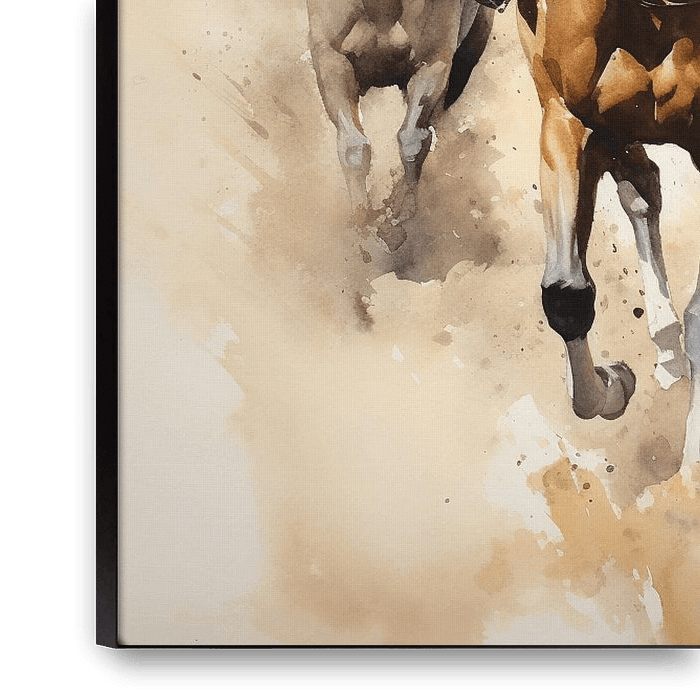 This dynamic watercolour captures the excitement of a horse race in a fleeting, impressionistic style. In the foreground, horses and their jockeys gallop in full action, with the foremost rider in a red helmet and bright pink jersey standing out in particular. The movement is skilfully depicted by splashing dust and blurred…