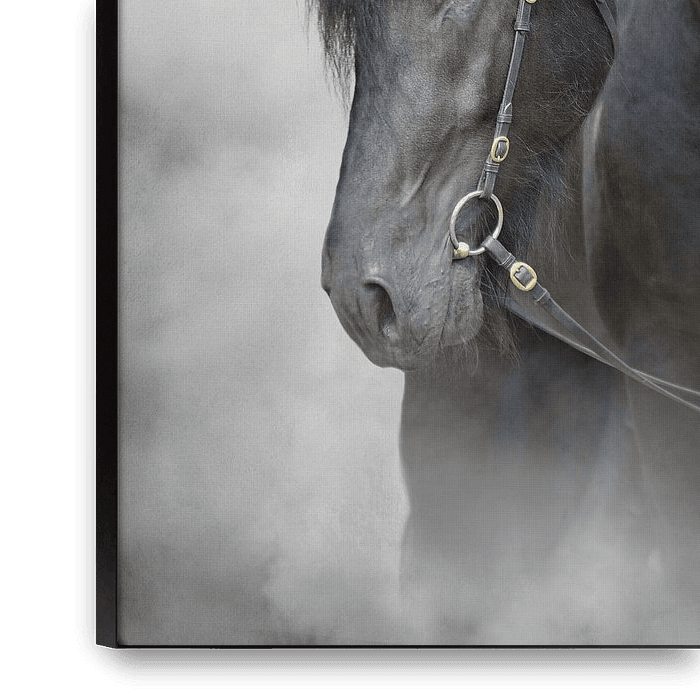 Dark brown horse with bridle in mist. The original photo has been digitally processed and was put on a subtle canvas structure.