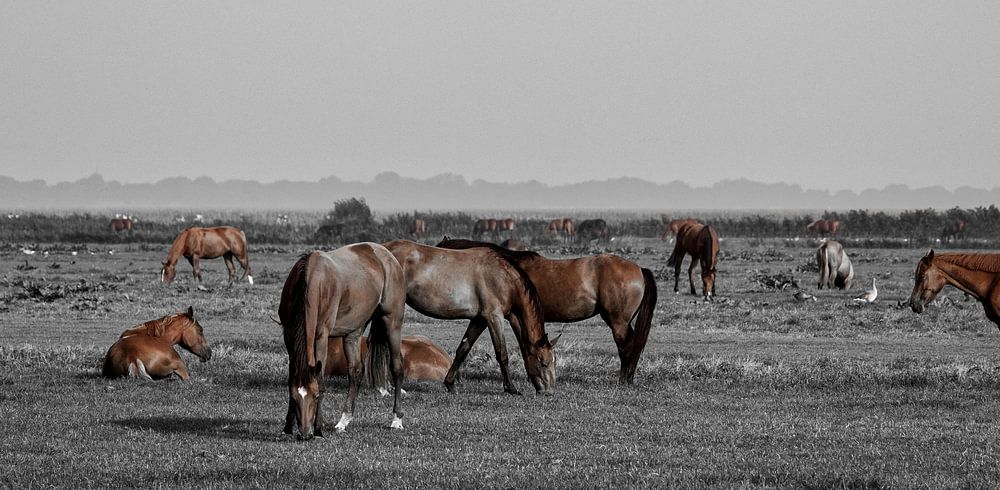In the Eemnesserpolder in the Netherlands are this beautiful herd of horses with here and there some geese. By using gloomy shades of grey in the landscape, the natural shades of brown of the horses stand out nicely.