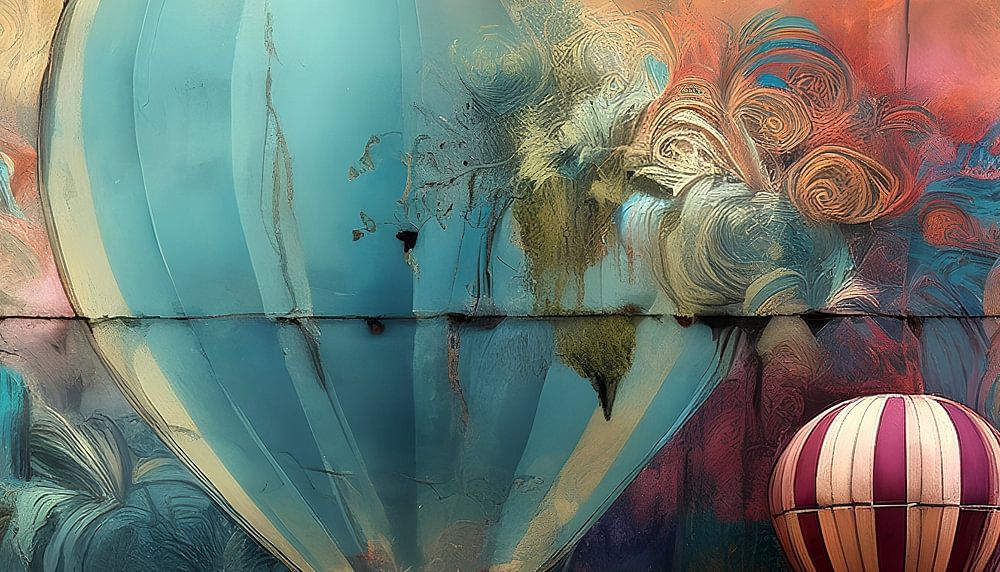 Graphic composition of graffiti representing hot-air balloons rising behind a partially dilapidated wall. The idea is to offer a sense of lightness in contrast to this old wall, which is in the process of being destroyed. The contrast between the dull, decaying wall and the azure-blue hot-air balloons rising into the air reinforces the idea of freedom and lightness regained beyond rigid, restrictive appearances.
