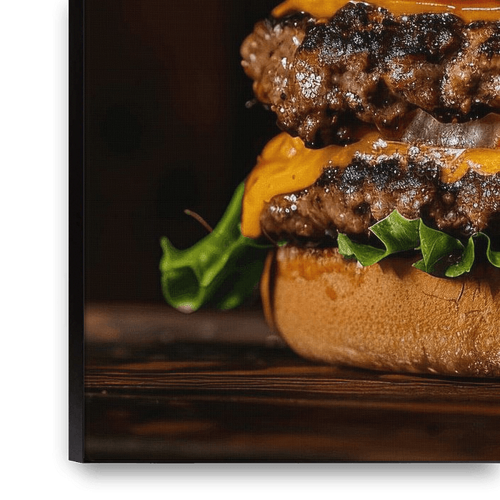 This vibrant artwork captures the essence of a perfectly cooked cheeseburger, complete with steaming cheese and crunchy ingredients. The realistic depiction and intense colours make it an eye-catching decorative piece for kitchens and dining rooms. An ideal gift for lovers of quality food and stylish kitchen décor.
