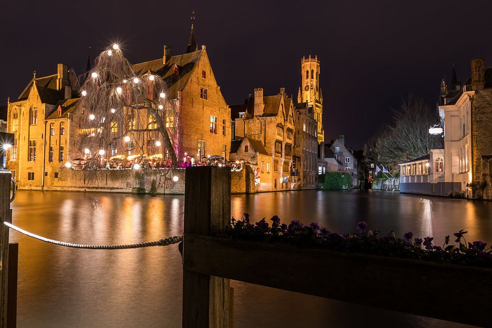 Classic view of the historic city centre with canal in Bruges, the province of West Flanders, Belgium. Night cityscape of Bruges during the Christmas period.