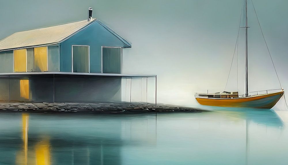 A boat lies in front of a house on a calm lake in light fog, minimalist, surreal.