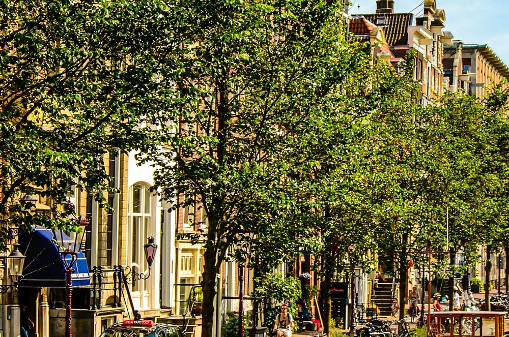 House facades and street boats on a canal canal in Amsterdam Netherlands
