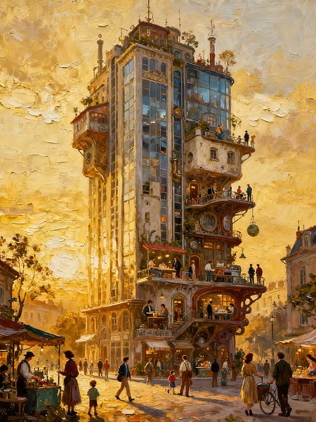 An extraordinary tower rises in the warm light of a golden afternoon. Urban life unfolds on several organically arranged levels: people on balconies, open windows, small encounters at lofty heights. The architecture combines nostalgic details with playful imagination, creating an almost fairy-tale-like cityscape. The structured, impasto…