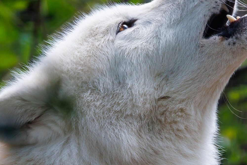 Portrait of a howling white wolf (Canis lupus hudsonicus)