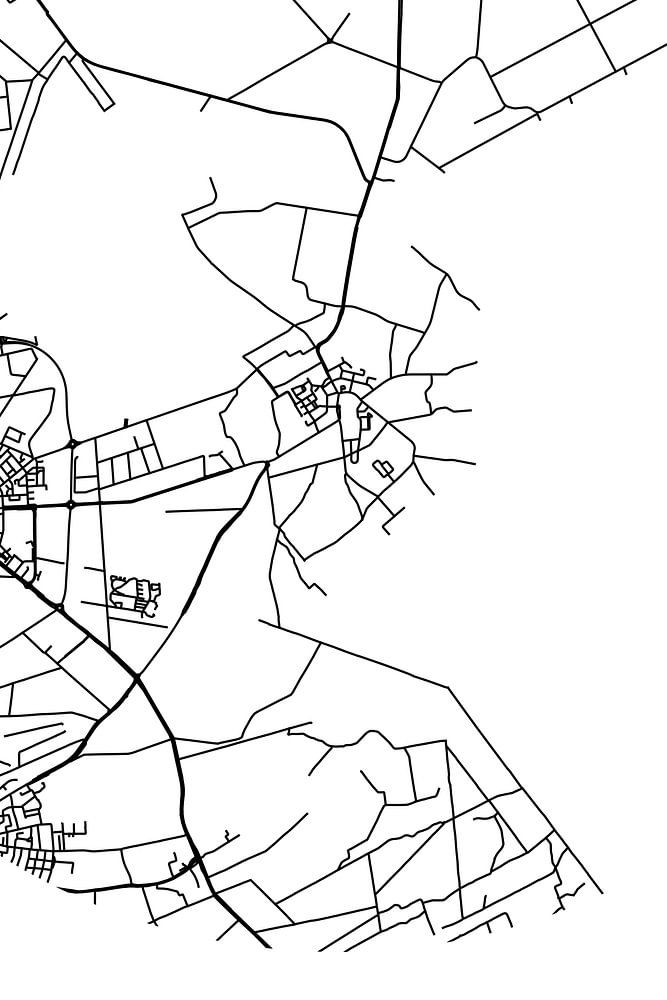 Black and white map, street map or street plan of Huijbergen. Huijbergen is located in the municipality of Woensdrecht, province of North Brabant. On the city map all public roads in Huijbergen are included. Furthermore, the map features the coordinates of the center of Huijbergen.