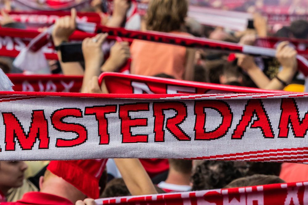 Voetbalclub Ajax is landskampioen geworden en wordt gehuldigd op het Museumplein in Amsterdam onder toeziend oog van duizenden toeschouwers en fans die fanatiek met hun sjaals zwaaien.