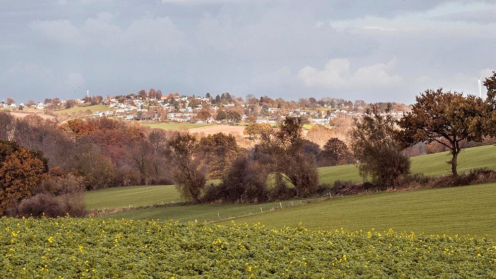 Fields between Baneheide and Eys on a sunny autumn day with the buildings of Hulst in the distance (South Limburg, The Netherlands)