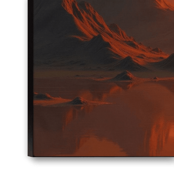 A digital painting depicts a solitary figure standing on a rocky shore, overlooking a calm body of water reflecting a fiery sunset. Jagged mountains rise in the background under a large, bright moon. The overall color palette is warm, dominated by oranges and reds.