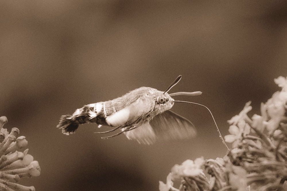 The adult butterflies suck nectar from flowers of plant species from different plant families. The hummingbird butterfly is active during the day but can also be found flying at dusk and at night.