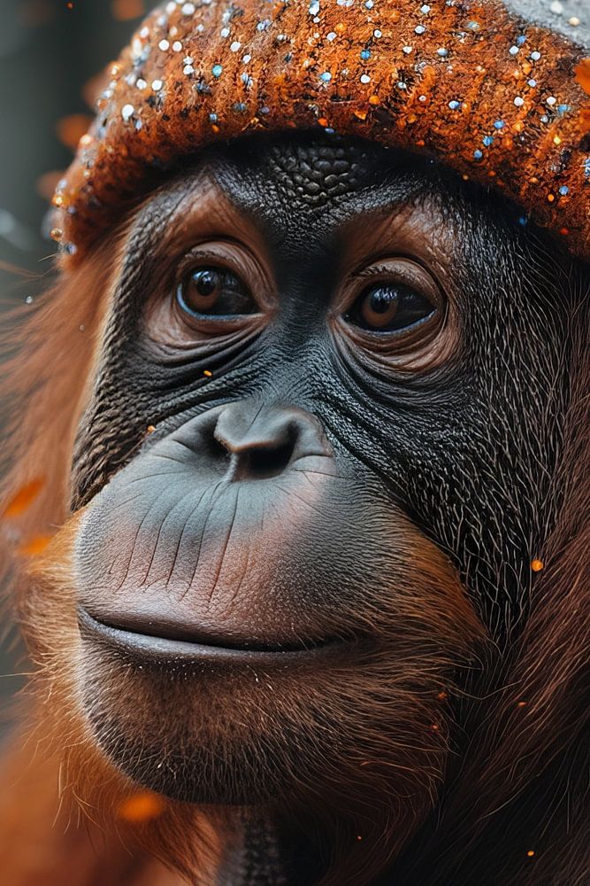 An orangutan dressed in a glittering 70s disco costume celebrates with a birthday cake and confetti.