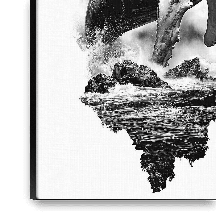 This dynamic black-and-white illustration captures the power of a humpback whale bursting from the sea, framed by rugged cliffs, mist, and textured ocean waves. The whale’s massive form is rendered with dramatic contrast—smooth highlight planes along the head and body are paired with fine engraved strokes that emphasize grooves,…