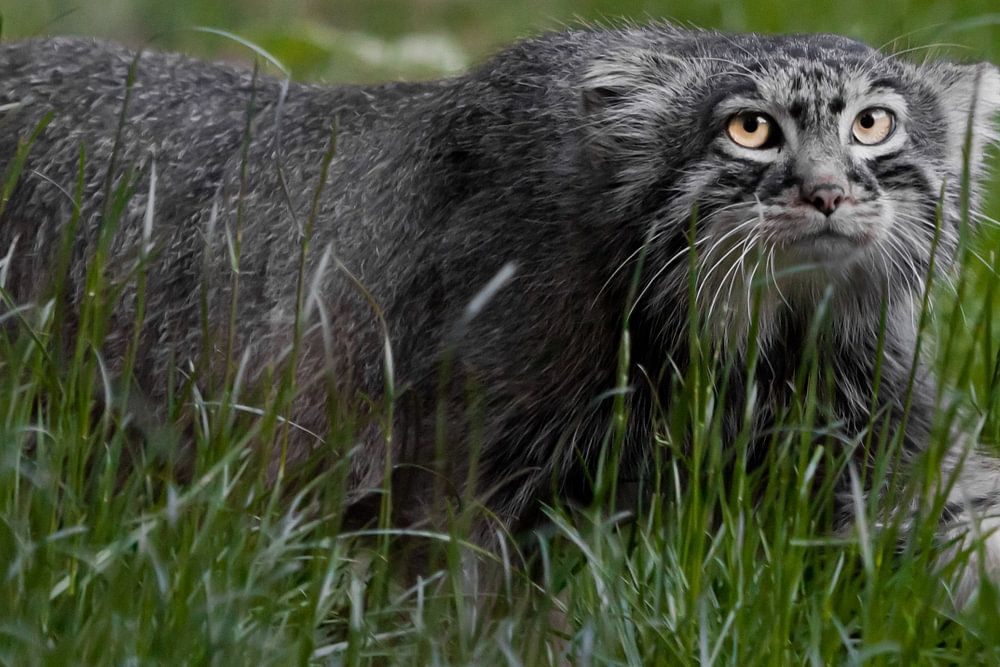 Hunt in the grass. Wild fluffy cat Pallas' stern look in emerald green grass.In profile in greenery.
