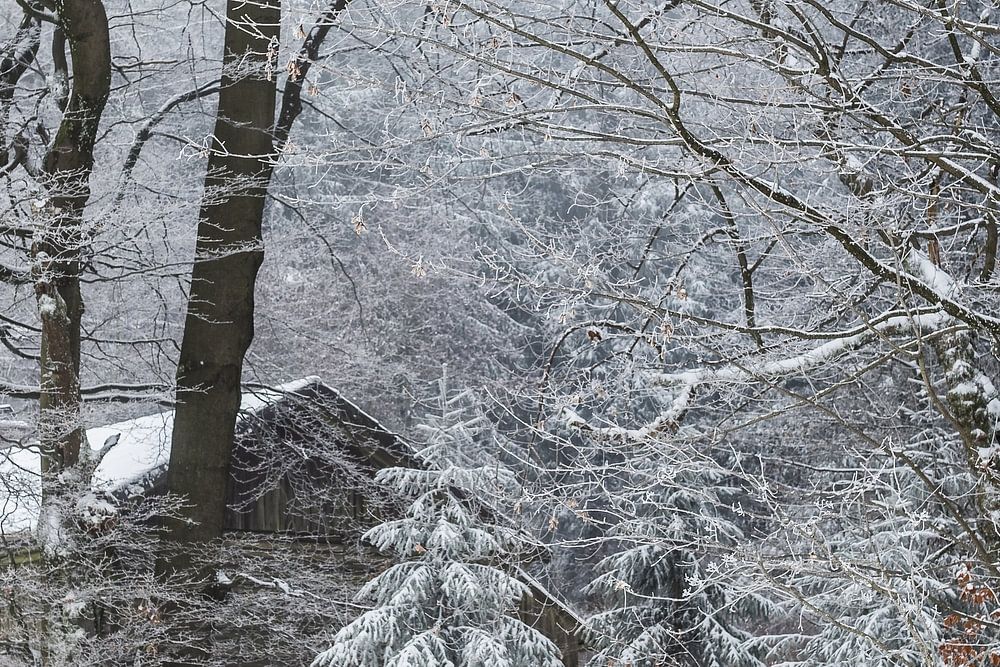 Snow-covered hut in the winter forest of the Hohenrodskopf.