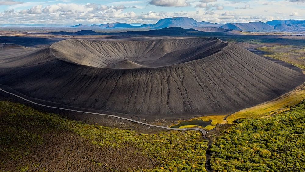 Hverfjall (or Hverfell), meaning hot-spring mountain, is a cone volcano 312 m high and it has a diameter of about 1 km. On its 140m-deep bottom is a small ash hill.