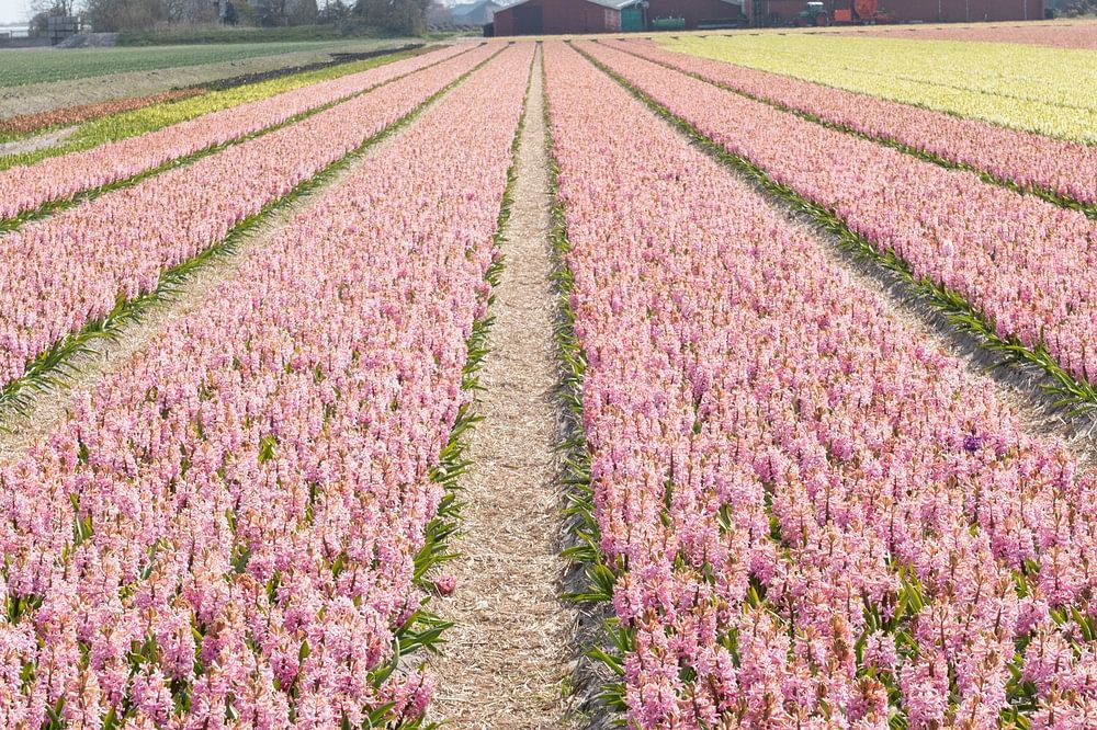 Spring in the Netherlands means that the fields change into a kaleidoscope of colour when the flower bulbs flower. While the area around Lisse is best known for the bulbs, there are also other places in the country where the colourful splendour can be seen, such as here in the between Petten and Callantsoog on the North Holland coast. Hyacinths