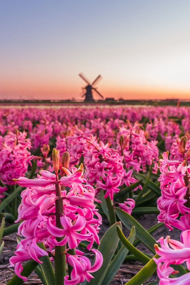 This image invites you to embrace the energy of spring and enjoy the invigorating splendour of flowers and nature. It reminds us how the seasons can constantly surprise us with their unique beauty. Immerse yourself in the colourfulness of the hyacinths and the majesty of the mill as you experience this vibrant spring beauty.
