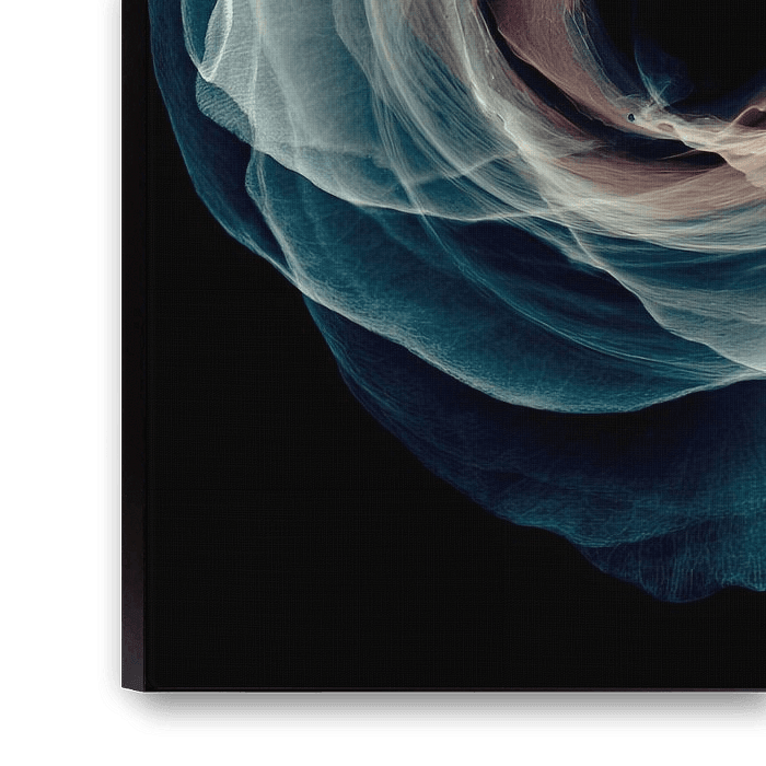 A hypnotic, almost ethereal flower shape constructed from transparent layers in soft shades of blue and salmon. The organic structure seems to breathe and twist at the same time, as if sucked into a light vortex of texture and colour. The work feels dreamy, modern and abstract, with a quiet depth that evokes both tranquillity and fascination.