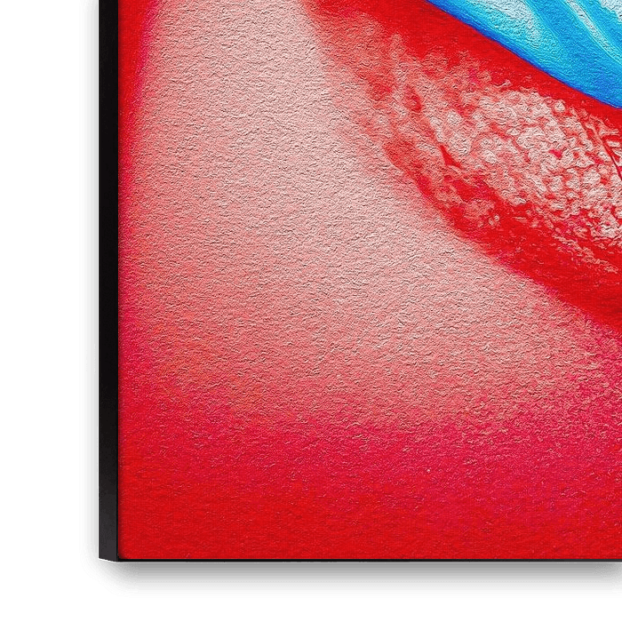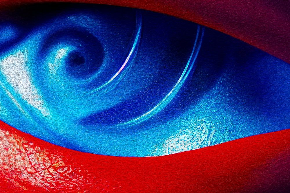 The look is hypnotizing and seduces the viewer to look into this eye again and again. The contrast of the colors, the tantalizing red of the skin and the soothing blue of the eye, plays on the viewer's conflicting emotions. The implied pupil spiraling to a point leads the viewer's gaze deep into the eye, searching to answer the question, what is, what does this eye want from me, the viewer. If they want to direct the gaze of their visitors in a room, whether at home, in the office or in your practice on a point that does not let go of the gaze of their visitor so quickly again, then this work of Max Steinwald may be just right for you.