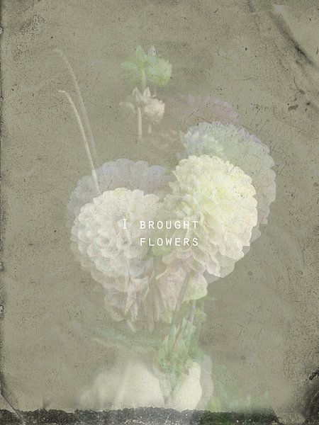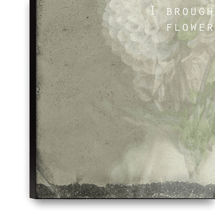 ‘I Brought Flowers’ is a combination of photography, text and digital image editing. The overall effect is a calm and serene image. The use of an old-fashioned photo filter and the colour palette give the image a vintage and authentic feel, making it a perfect fit for a natural, authentic interior. The image is poetic and tranquil.