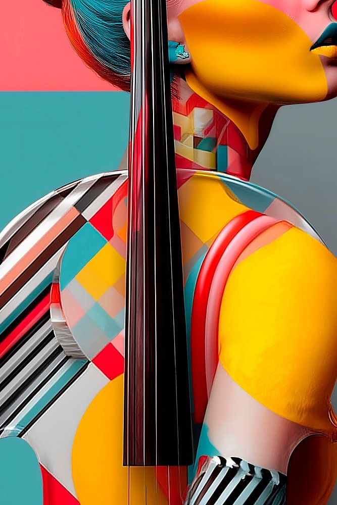 An artistic artwork of a woman holding her violin in a striking pose, she is painted in a vibrant abstract style with striking geometric patterns and a palette of bright colours. Her body is integrated and blends seamlessly with her violin. The overall composition conveys a sense of harmony between the woman and her violin and passion for music.
