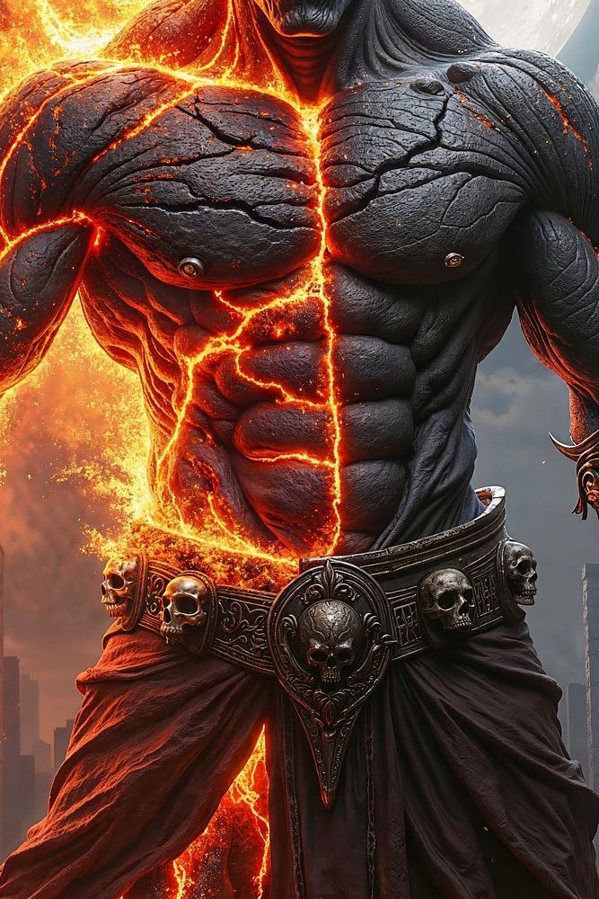 From the burning depths of the earth rises a figure, half flame, half stone, with horns piercing the sky. Glowing cracks carve his body while his gaze burns in the blaze of the inferno. Behind him shines the full moon, cold and merciless above the fiery scenery.