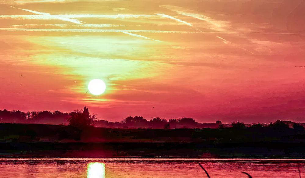 Photo shows sunset IJssel near Deventer. Beautiful colours. Tranquillity. The buildings in the background are clearly visible. Beautiful surroundings. Free walking in the meadows and enjoying the beautiful nature.