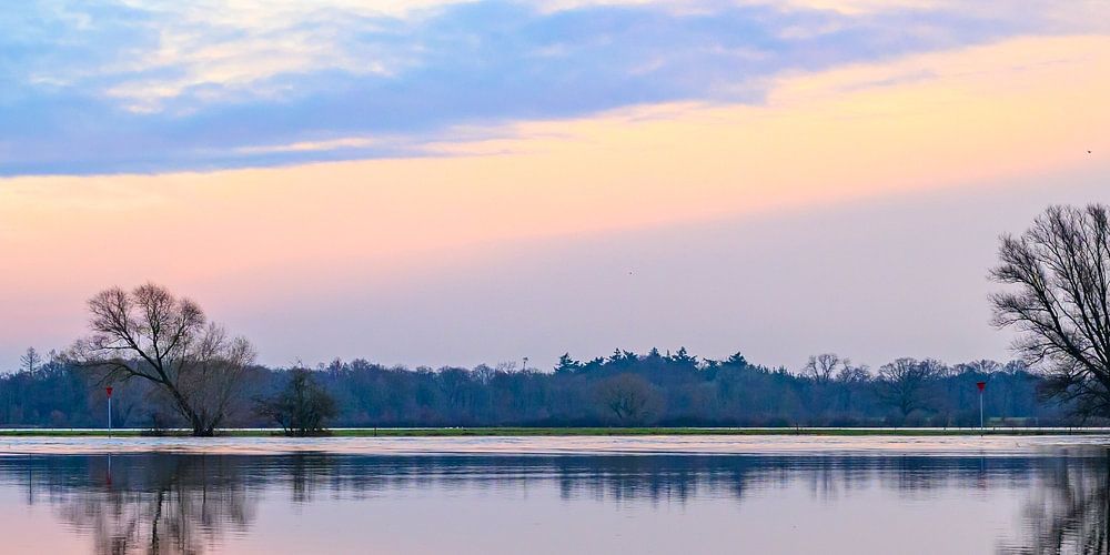 IJssel winter light with high water level on the floodplains near Deventer after long periods of rain upstream. The overflown trees are reflected in the calm water of the river.