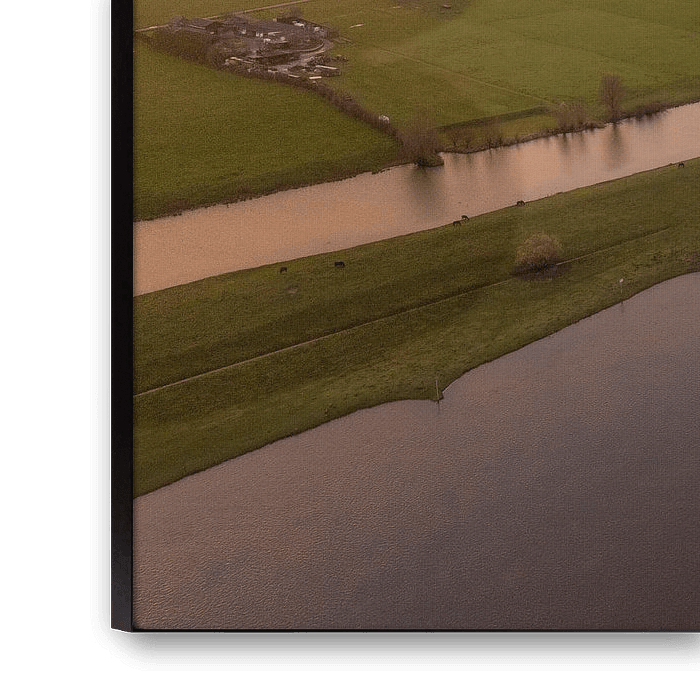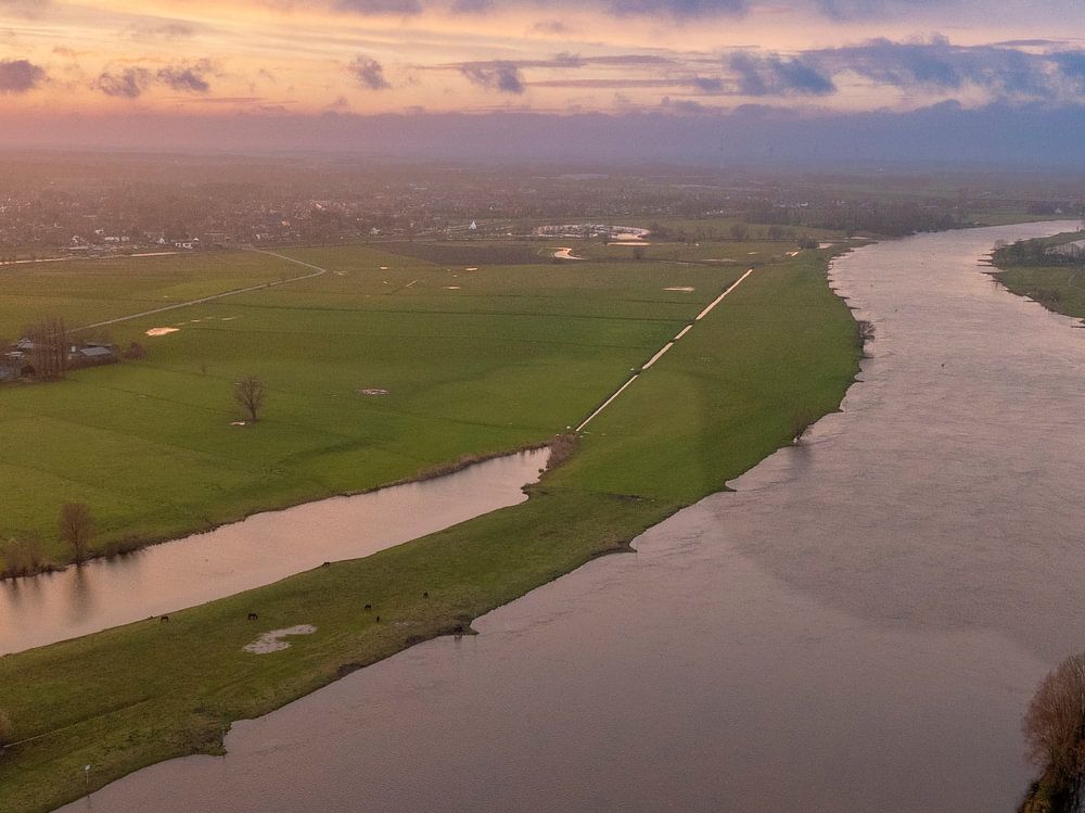 IJssel river with high water level on the floodplains of the river IJssel near Zwolle and Hattem on the riverbanks of the river during a moody winter sunset.
