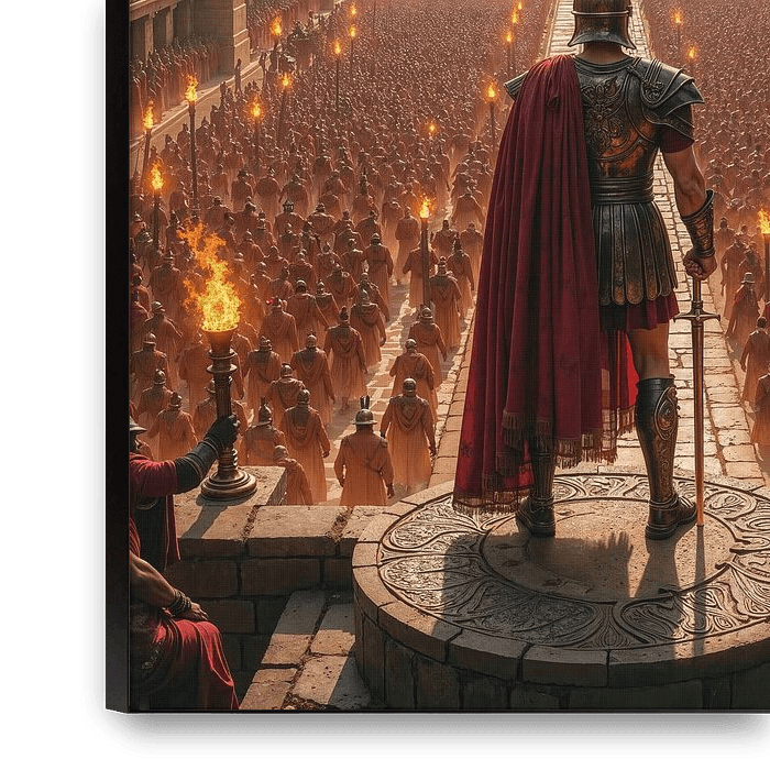 In the golden light of a breaking sky, the Roman emperor stands elevated above an endless mass of soldiers. Torches burn along the stone axes of the city, banners rest in the warm wind, and his gaze extends across thousands of helmets into the depth of the forum. Architecture, order, and power converge into a moment of absolute…