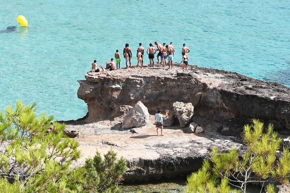 Who dares? Jumping from this high rock in the Balearic Sea off the coast of the island of Ibiza. Adrenaline! The clear blue sea beckons...