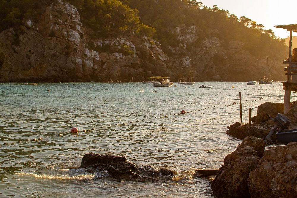 An idyllic Ibiza beach with people enjoying the sunset. The beautiful blue sea and the bright sunlight