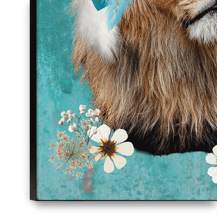 If you like BOHO chic or just lions, this design will appeal to you. A very cool lion's head with feathers and white flowers all around, a bit of a hippie lion. The background is an old weathered wall in turquoise blue. We have combined real photos and drawn elements. Sweet, cool and hip, this design fits well in a light modern…