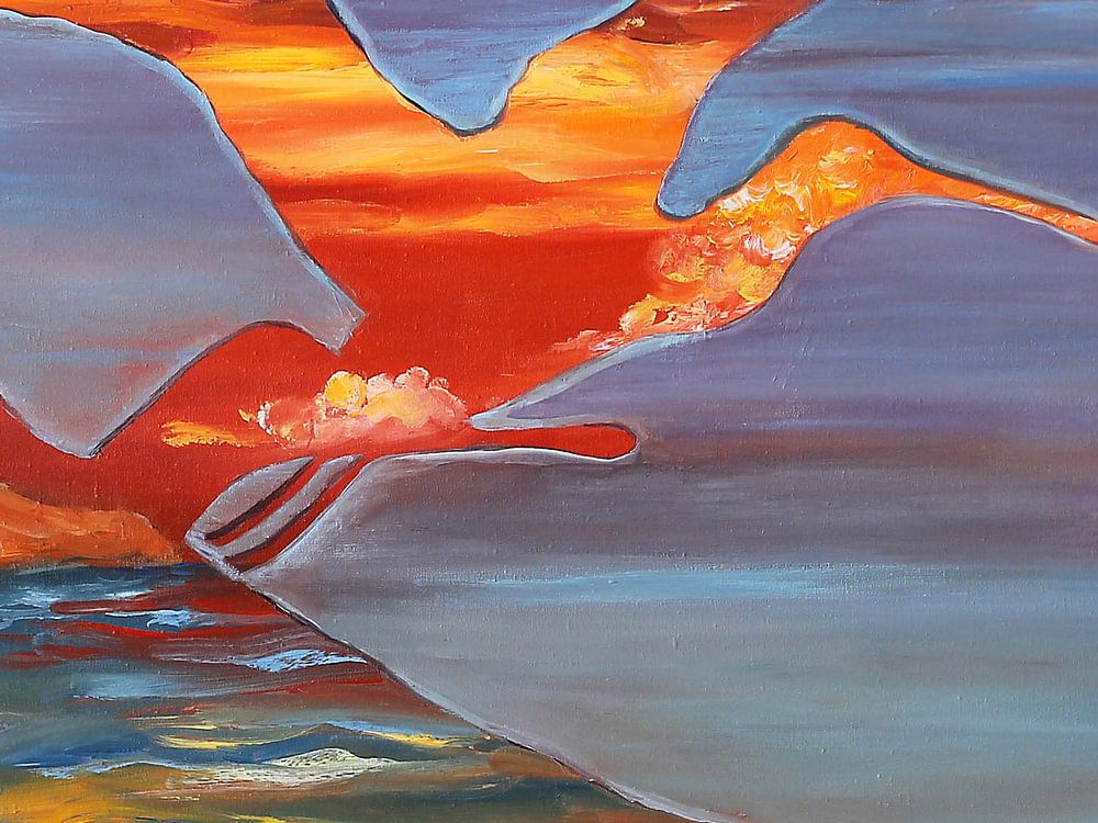 Prachtige afbeelding van drie vogels, waarin je een zeezicht bij zonsondergang ziet. Het schilderij is geïnspireerd op het verhaal over Icarus.