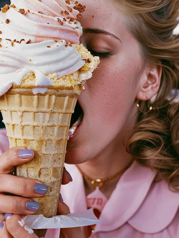 Ice, Ice, Baby! Humorous portrait of a young woman with a vintage touch. The woman is eating a huge ice cream and is fumbling incredibly. A work with a wink!
