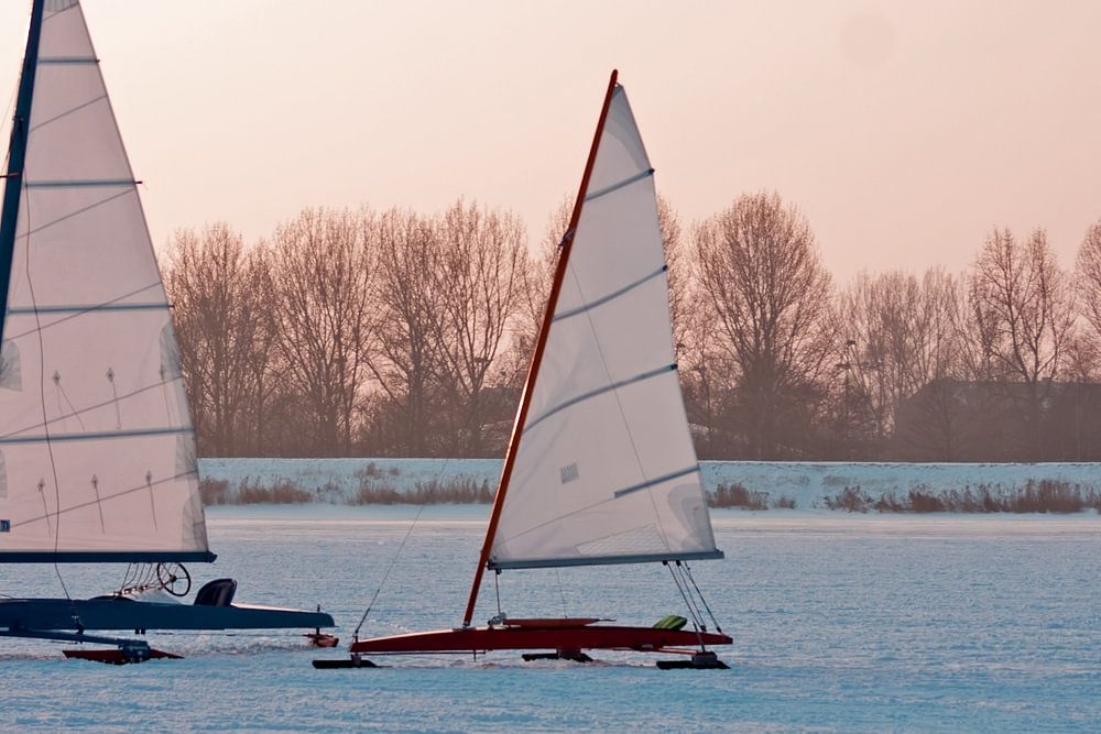 Ice sailing on a cold winter day on the Gouwzee in the Netherlands at sunset